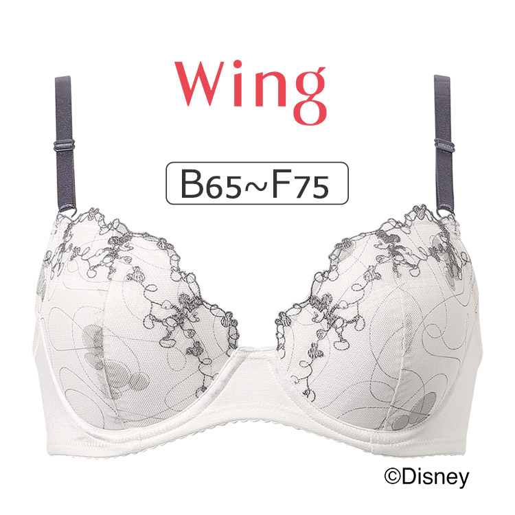 ウイングブランド誕生50周年を記念したスペシャルデザイン。世界中で大人気のディズニーキャラクターをデザインした特別なアイテムが登場です。ポイントは、「ミッキー」を描いたかわいいレース。思わず集めたくなる2柄×2色の展開です。ナチュラルアップブラはふっくらボリュームアップしてバストメイクしたいけど、くっきり目立つのは苦手な方へおすすめ。肌ざわりのよい素材にこだわり、ふんわりバストにフィットして、つけごこちも、シルエットもナチュラルにバストアップ。取りはずし可能なパッドでボリューム調整もできて、自然でまるみのあるバストラインを演出できます。