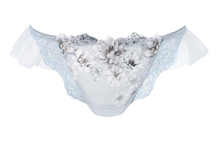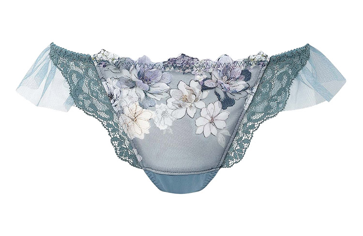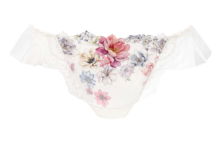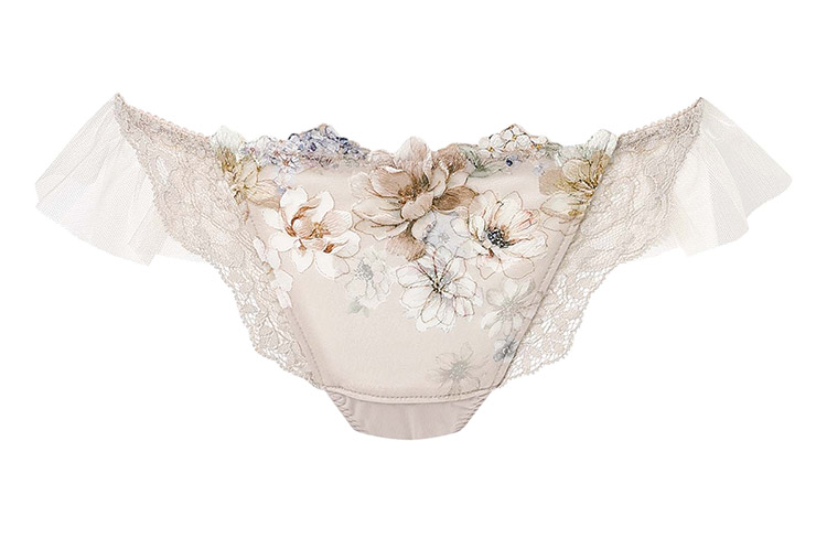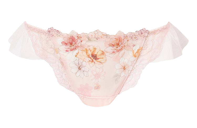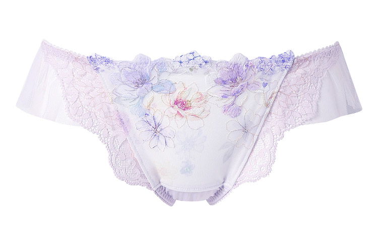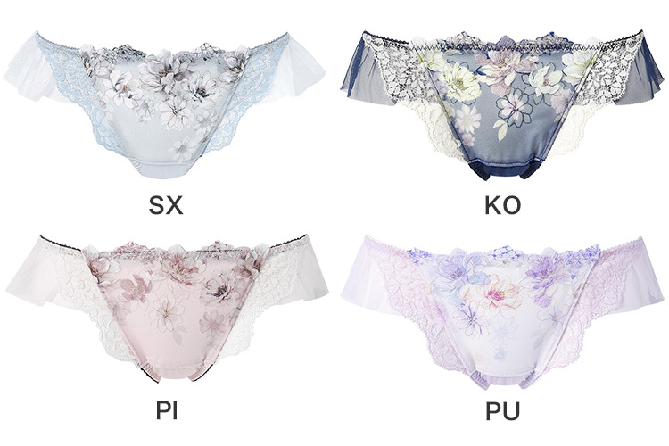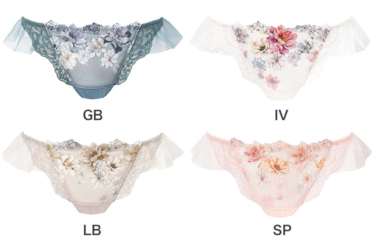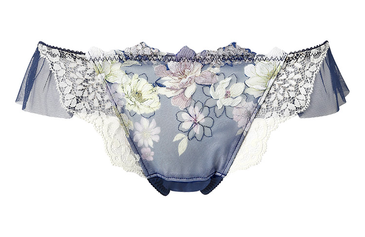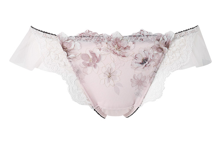 「リボンブラ 脇すっきり(BXB443)」とペアコーデが楽しめるTバックショーツは、ラッセルレースをサイドにあしらった豪華なデザイン。動くたびにふわりと揺れるチュールがアクセント。