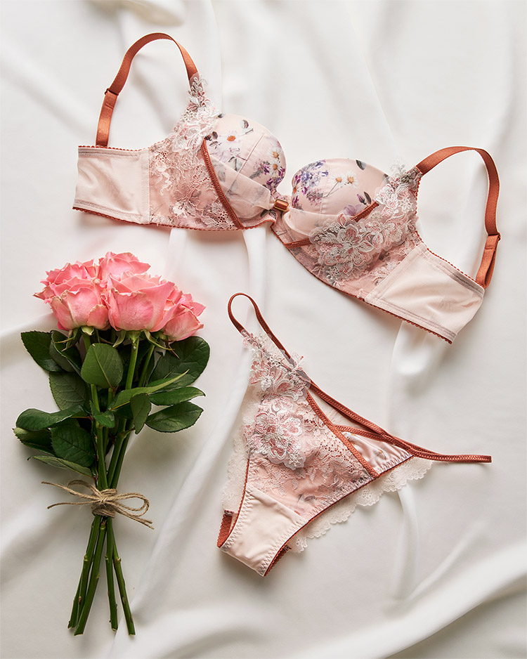 キラキラと光るラッセルレースにパイピングを効かせたインポートライクなデザイン。