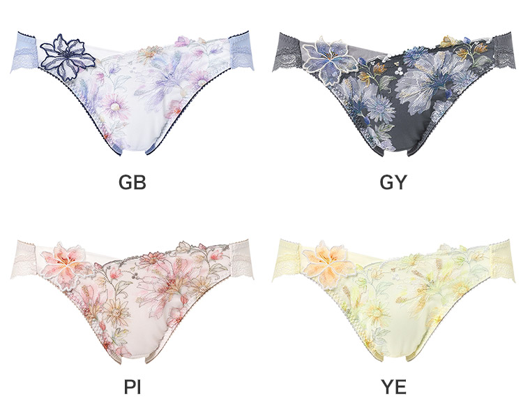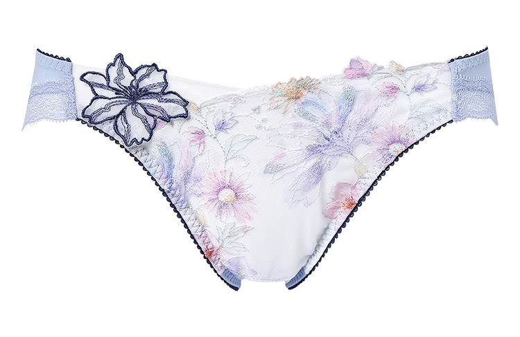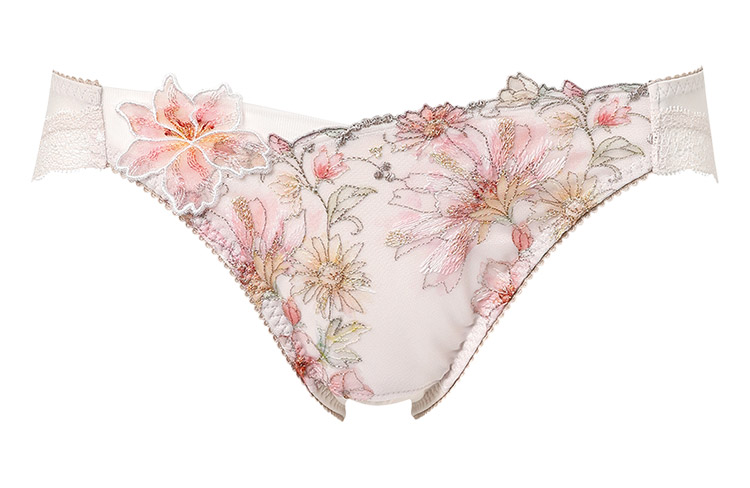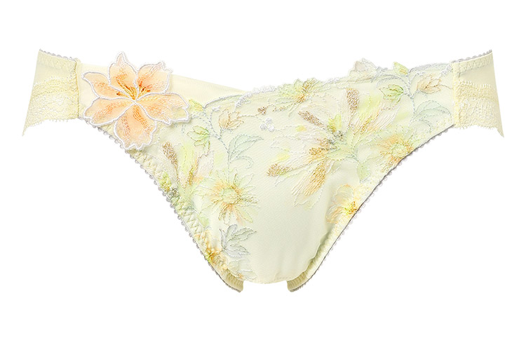 フロントのレースには繊細に輝くラメ糸を散りばめ、華やかなアップリケをワンポイントにあしらった優雅で贅沢なショーツ。M・Lサイズはフロントサイドに、LL・3Lサイズはフロント上辺に透け感のあるチュールを用いて、軽やかなデザインに仕上げました。あさめのはきこみ丈で甘すぎずすっきりとした印象に。