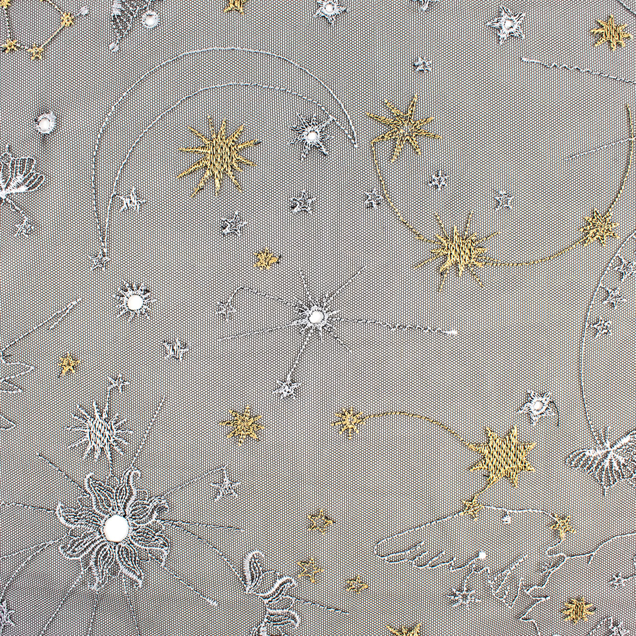 ユニコーンや白鳥、イルカが星座と共に刺繍された幻想的なチュール生地。小物作りやワンピース、インテリアまで幅広くご使用いただけます。