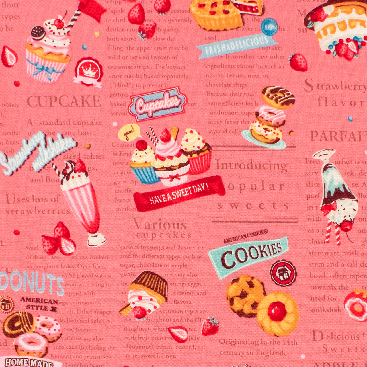 アメリカンなスイーツ柄です。大きすぎず、お洋服から小物まで使いやすい柄です。