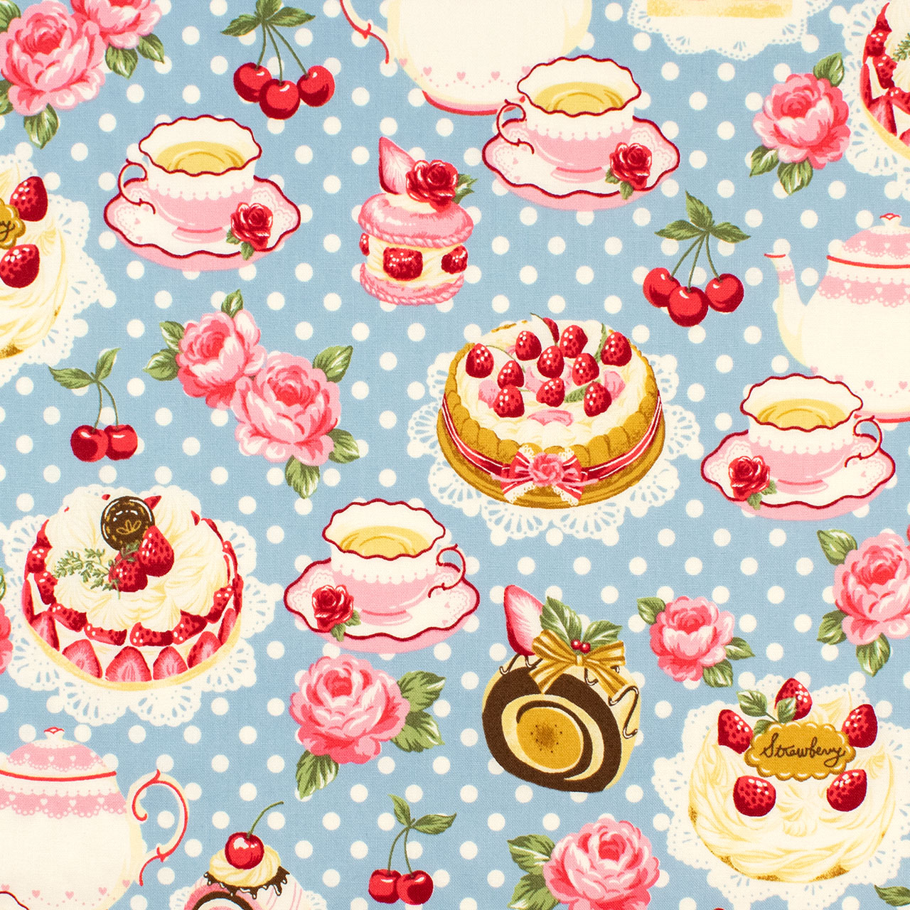 ケーキとティーセットがラブリーな柄です。薄手なのでお洋服づくりにもおすすめです。
