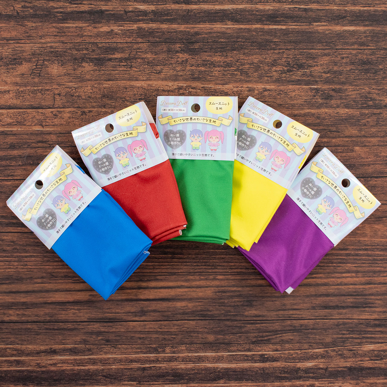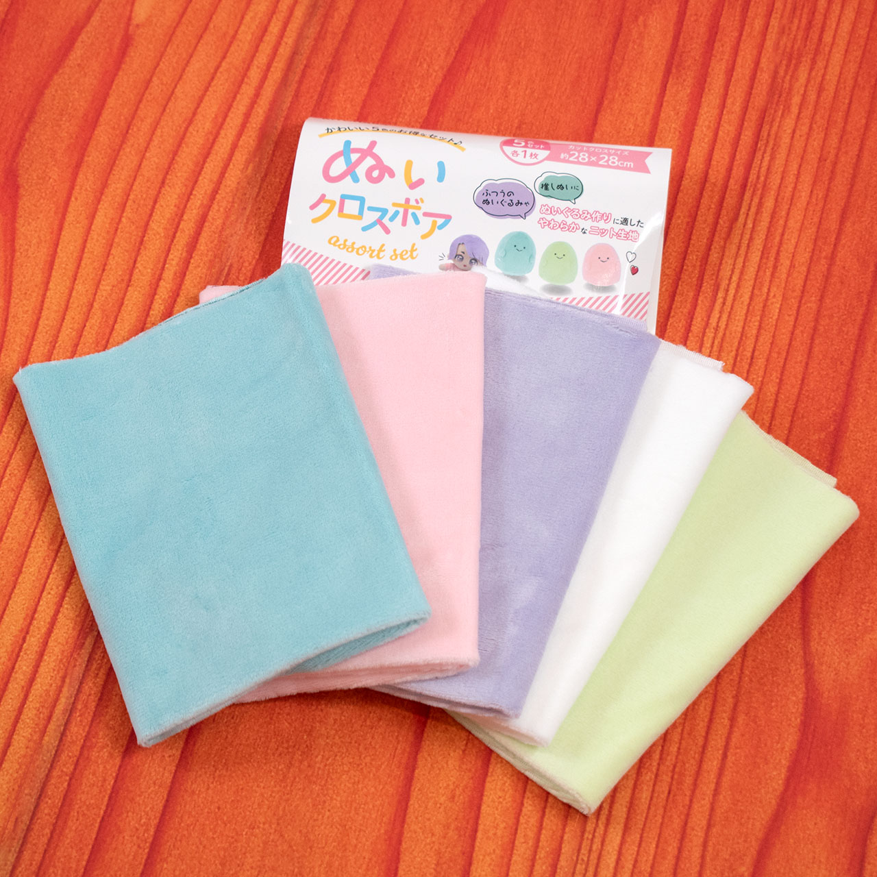 ぬいぐるみ作りに最適な、なめらか手触りのニット生地。かわいいカラーが5色入ったお得セットです。
