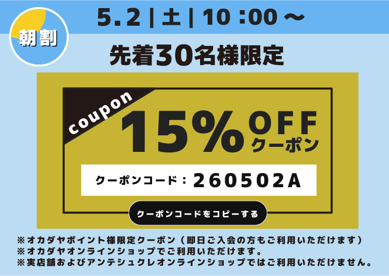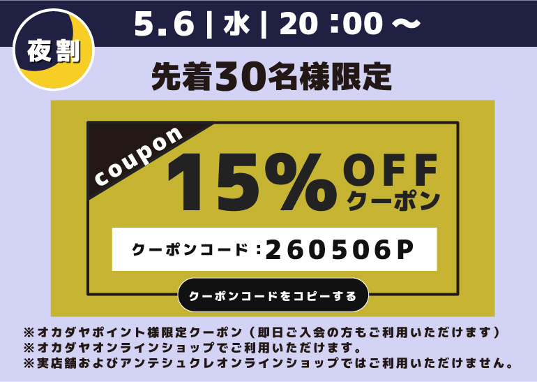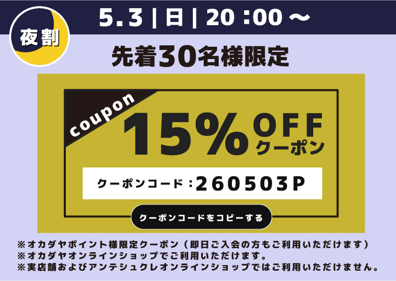 - ※オカダヤポイント会員様限定クーポンです。会員ログインしてご利用ください。