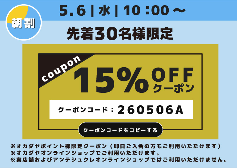 毎朝10:00~・毎晩20:00~ 各先着30名様限定!15%OFFクーポン